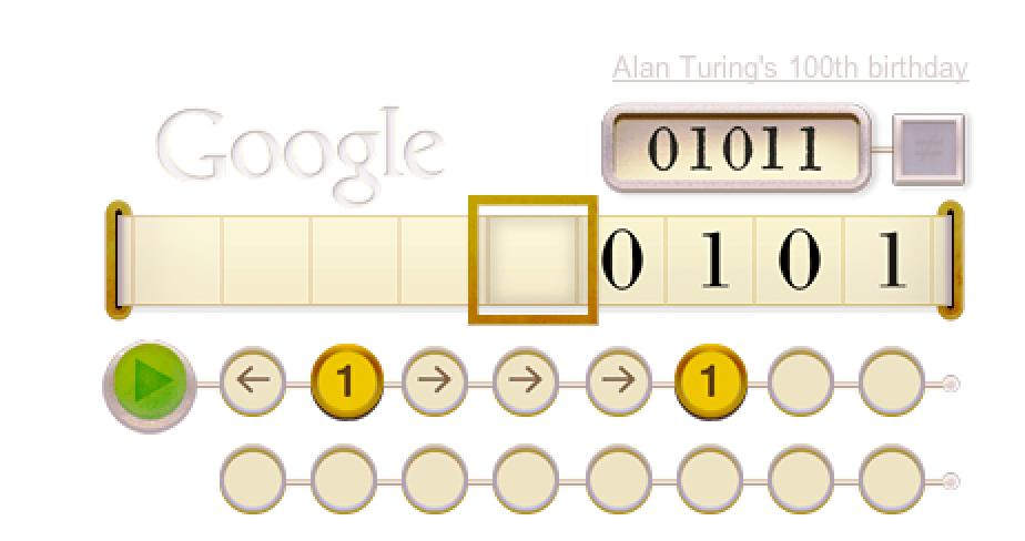 Today’s Google Doodle is a working Turing machine that contains six puzzles. Sophia Foster-Dimino, Jered Wierzbicki, Corrie Scalisi, and Marcin Wichary on Google’s Doodle team built the app in honor of Alan Turing’s 100th birthday.