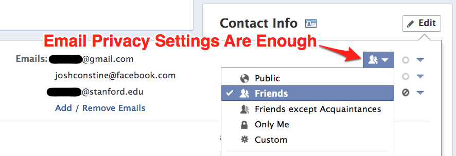But this setting is redundant since you could already set the privacy of each of their email addresses to any category, list, or specific person they wanted. Had it defaulted to all addresses be shown on Timeline to the same people that could see them before, everything would have been fine. Unfortunately, Facebook erred too far on the side of privacy, locking down the visibility of personal addresses by defaulting them to “hidden”.