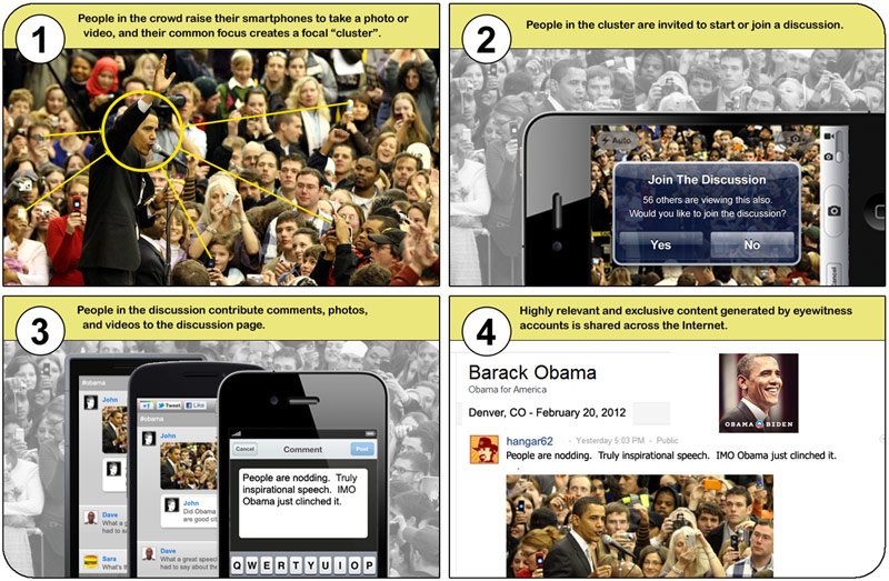 The emergence of a service on Yahoo’s video platform is another sign of what may be to come. Using Yahoo’s Connected TV Device Communication protocol, CrowdOptic helped created an interactive service that lets people use their mobile devices at events to record video and their own commentary. When multiple users hone in on a specific point at the event, CrowdOptic’s technology identifies them and they form a “cluster” that can interact with each other. A diagram of how it works is below.
