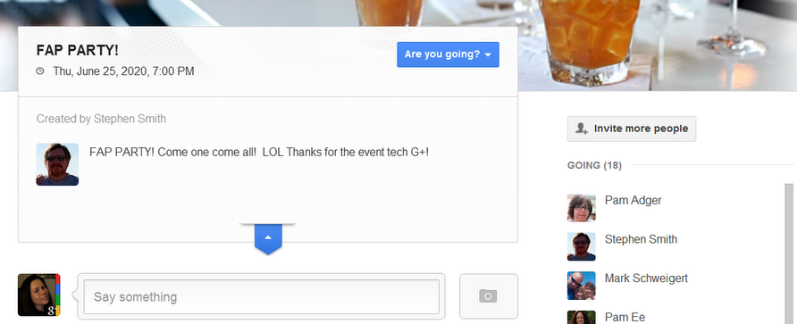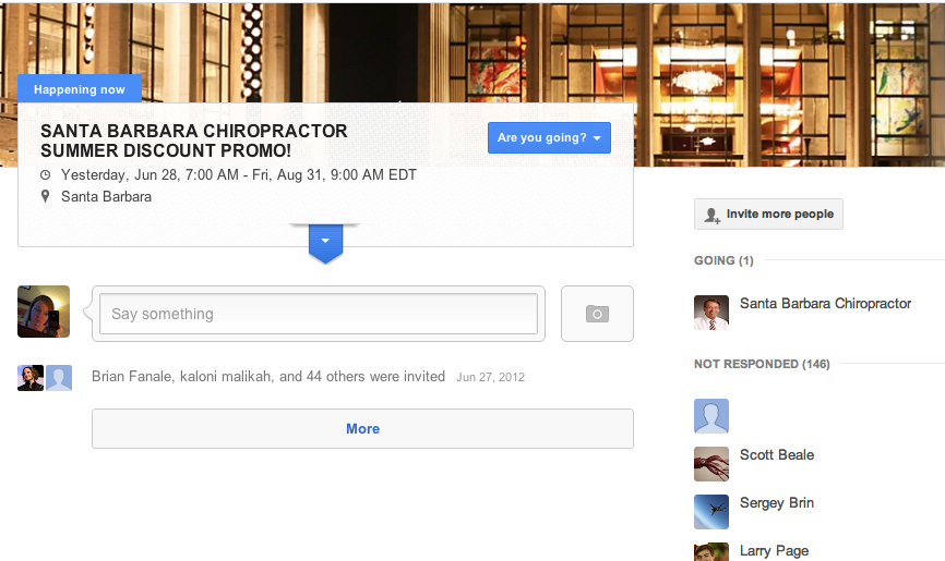 There has been some confusion on who can add you to an event. Wheaton says, quote: “To be clear: People who I have in a circle can send me an event. People who have me in a circle, but who are not circled by me, can not.” Others say they have been “relentlessly spammed by strangers.” Here’s an example of some really awful event spam. (Notice the spammer had invited Sergey Brin, Larry Page, and Linus Torvalds!)