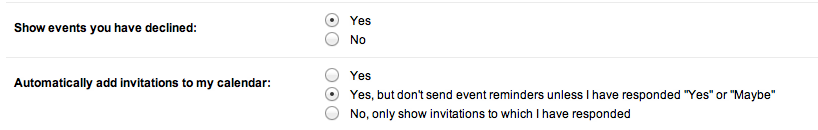 In the meantime, you can take matters into your own hands. Head into your Calendar settings, and turn “Show event’s you’ve declined” to “No,” then switch the “Automatically add invitations to my calendar” setting from “Yes” to “No, only show events to which I’ve responded.” That will stop the influx until the changes Google is promising roll out to everyone.