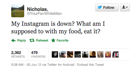 According to Twitter, the most-tweeted Instagram-down-food joke so far comes from Jason de Plater (and I love that his name even has a food pun in it! how cool is that?), with currently over 5,000 tweets.