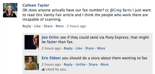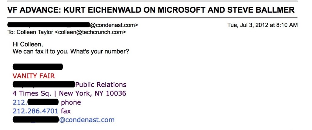 Now, that’s a question I certainly never thought I’d encounter from someone pitching a story to TechCrunch — unless we were being punk’d once again, or perhaps if it was a piece that required crazy sensitive court documents or something. Who faxes anymore? OK, besides Karl Lagerfeld and Anna Wintour (maybe it is a Condé Nast thing.)