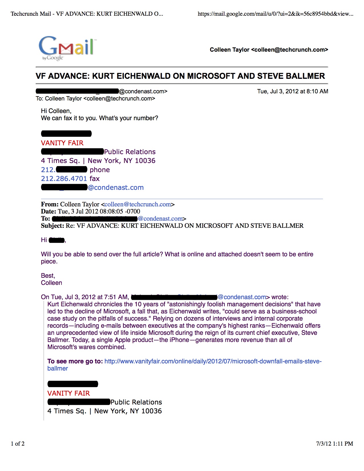 So, I was pretty excited to get an email from one of Vanity Fair‘s publicists this morning, offering an advance copy of a story that will run in the August issue. Written by Kurt Eichenwald, the piece is promised to be an unflinching deep dive into the past ten years at Microsoft while Steve Ballmer has been at the helm — specifically, I’m told, Eichenwald uncovers the stifling bureaucracy and “astonishingly foolish management decisions” that have held Microsoft back while Apple ascended to dizzying heights in the eyes of global consumers and the stock market.