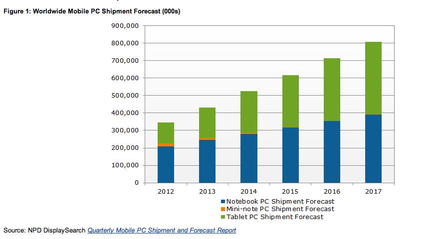 But by the way, this is not to say notebooks are dying. Far from it — they will still account for 49 percent of the mobile PC market, NPD says, shipping 393 million units in 2017 compared to 208 million in 2012. It adds that notebook makers are also taking heed and looking to put more tablet-like features into their products — for example, becoming thinner and incorporating touch functionality.