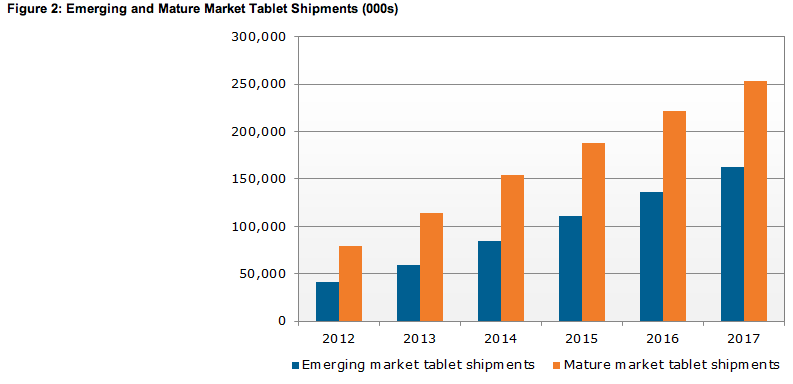 But over that time, the rise of tablets will remain largely a story about developed/mature markets. Regions like North America and Western Europe, along with single countries like Japan, currently account for 66 percent of all tablet shipments (and most likely sales), and that proportion, NPD predicts, will remain in the 60 percent range for the next five years. That works out to 254 million units by 2017, versus 80 million today.