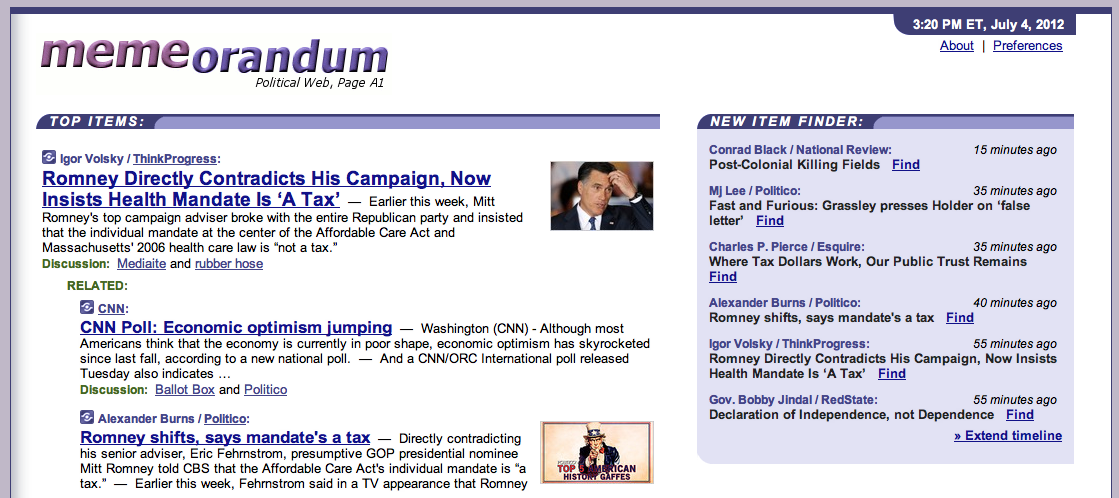 While other political news sites might need an army of editors to stay so up-to-date, Memeorandum is sorted entirely algorithmically. Thanks to the cold, hard wisdom of computers, Memeorandum stays unbiased so you can make up your own mind.