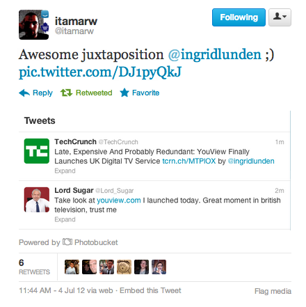 Update: A reader sent me a picture of how this story posted in his twitter feed, ironically just at the same time as a tweet from Lord Sugar himself. Don’t you love serendipity.
