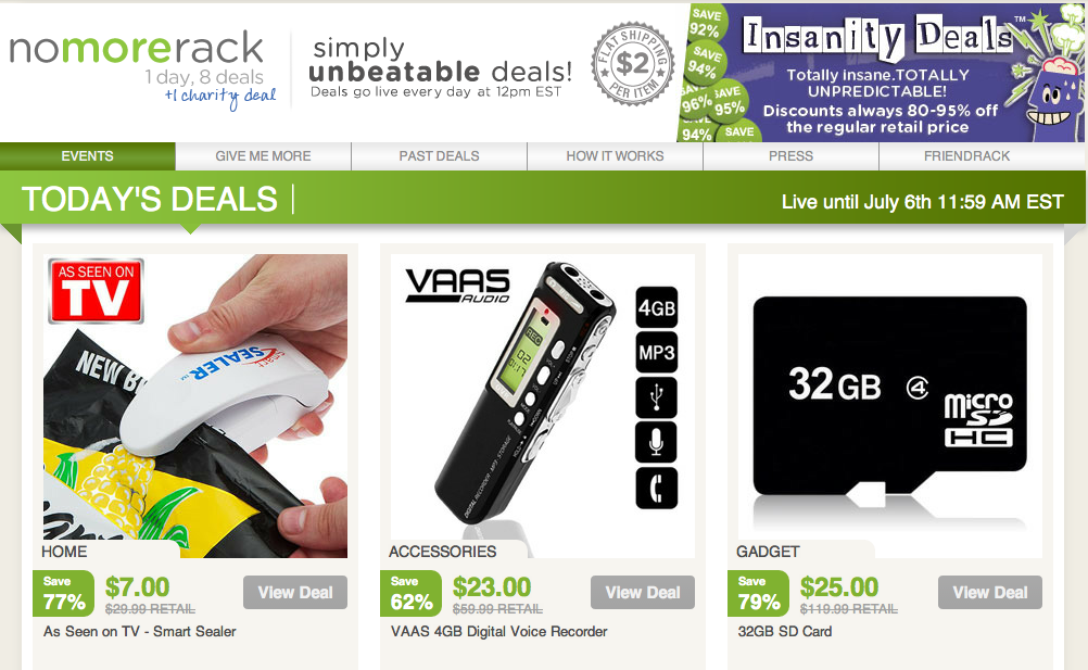 But like Fab, ask the NoMoreRack founders how they define their business, and they’re quick to say they’re not a flash sales site. That’s not exactly true, as the site offers nine big deals per day, posting those discounted items for sale at the top of the site (along with hundreds of other items) in the morning and wrapping up every night, meaning that most deals last 24 hours. That sounds like a flash sales model, doesn’t it?