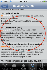 According to the developers we’ve spoken with, the one-star reviews are not actually being removed from the iTunes App Store, they’re just being hidden. There seems to be some confusion on this point, however. For example, the folks at Readdle, makers of the Scanner Pro, blogged about the situation, noting that “Apple has decided to remove ALL comments of corrupted apps on the App Store, since many of those get 1-star ratings from angry users.”