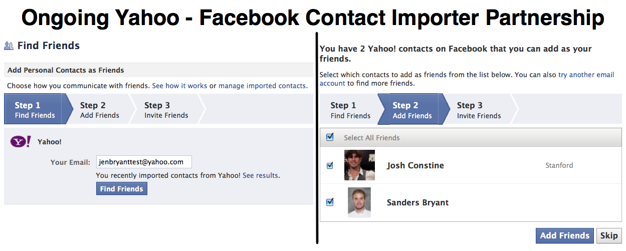 Meanwhile, the long-standing contact sharing partnership between Yahoo and Facebook will continue, sources confirmed. It allows users that sign up for Facebook to automatically import that Yahoo Mail address book to make it easy to find and become friends with those they email with. Facebook and Google once had a similar partnership for allowing contact importing from Gmail, but Google famously cut it off because Facebook wouldn’t allow users the “data portability” to export their friends’ email addresses.