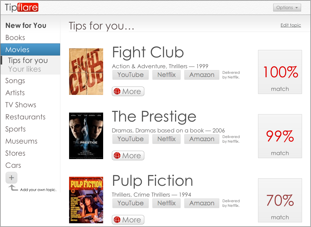 If you’ve ever struggled to find a recommendation for a good book that’s actually based on what you like to read and not just your browsing or purchase history (Amazon, for example) and then repeat that for a good movie, Tipflare’s value is obvious. If not, you might just say, hey, why not go to GoodReads or Amazon or Netflix? And it’s true that, using Netflix as an example, those that specialize in one domain will probably be better at recommending (say, movies) than a generalist.