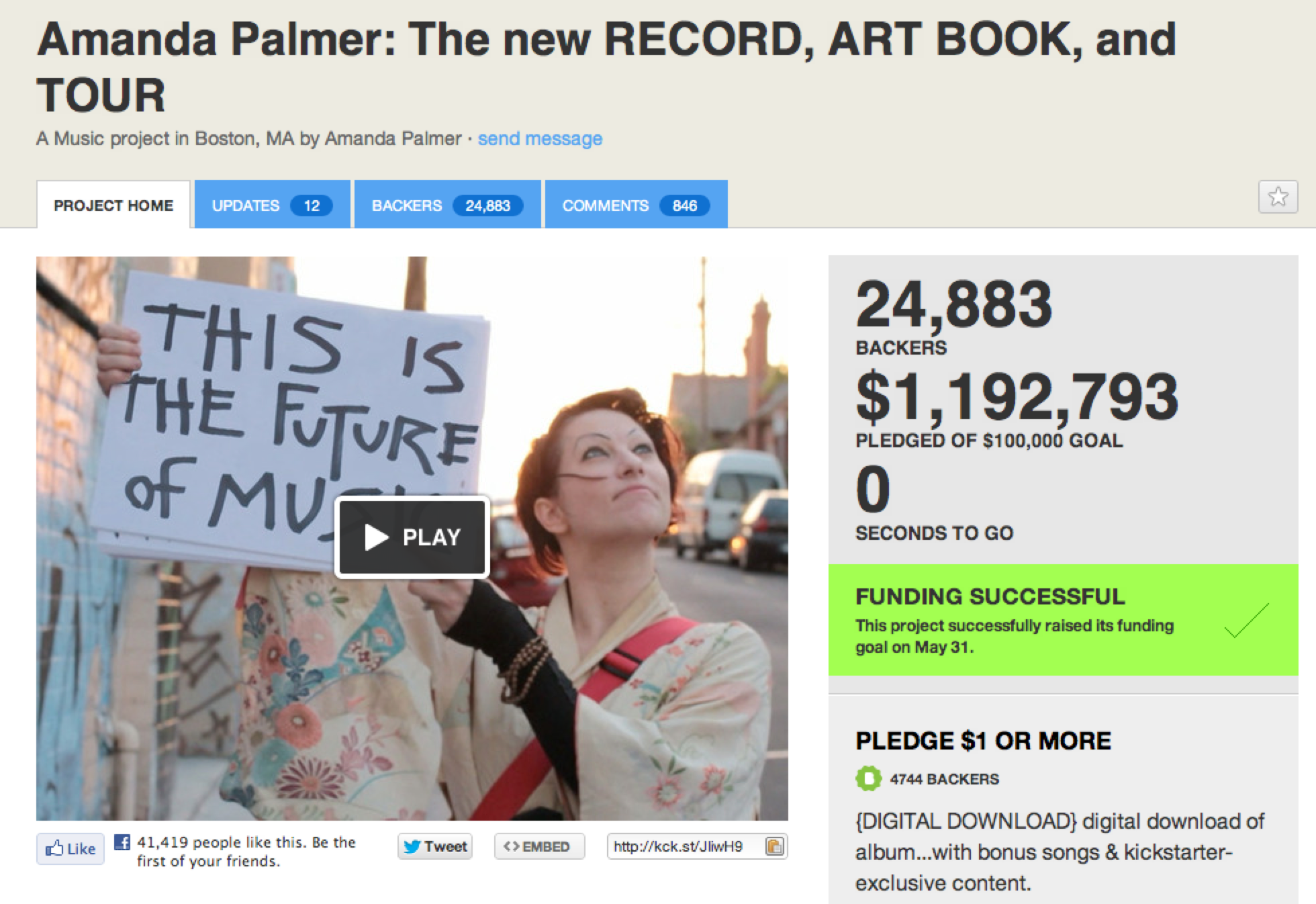 Amanda Palmer has the most-funded Music project on Kickstarter to date. She set a $100K goal and made over $1.1 million. Amanda’s goal was pretty simple: It was to raise money to release her new album. Kickstarter wrote a lengthy description of Amanda’s milestone (becoming the first musician to reach $1M), so we won’t re-hash the whole thing here. But, in case you missed it, there’s plenty that applies to this discussion — and echoes what’s been said by other project founders.