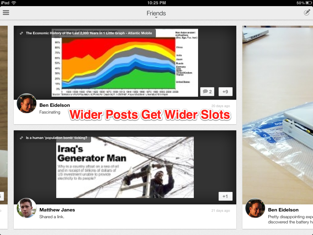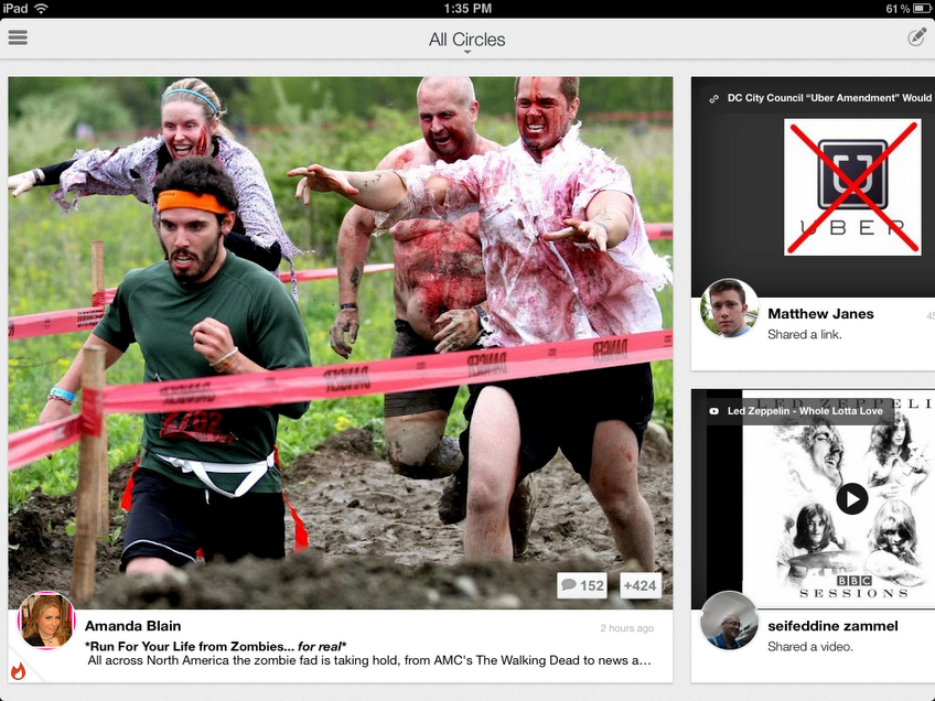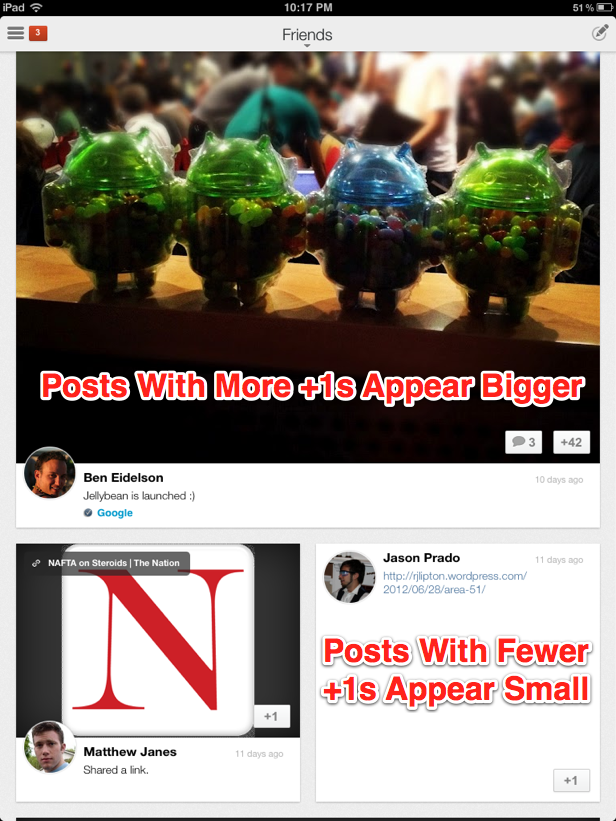 You shouldn’t have to squint at Like and retweet counts to discover the best content your social network has to offer. So with one simple design choice, Google+ for iPad (and Nexus 7 ) has created a better tablet feed reading experience than Facebook or Twitter. As Google announced at I/O, on tablet, Google+ posts with more engagement are shown larger.