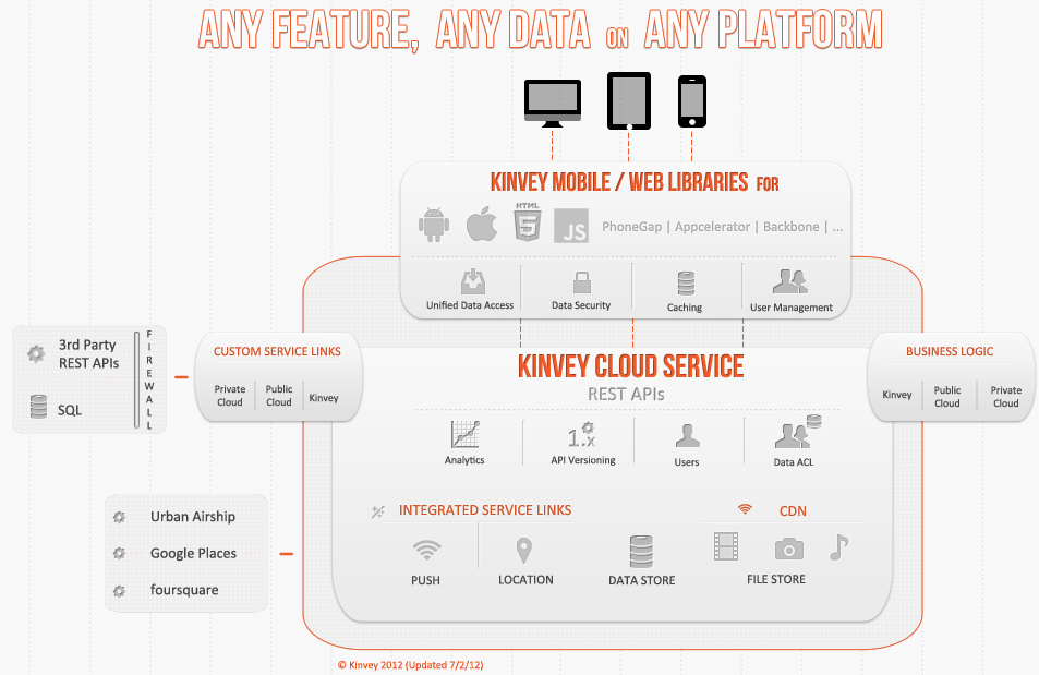 Kinvey has developed a backend environment that glues these different fragmented environments together. It’s a unified process between the client and the cloud with a unified API and software libraries. It also includes a back-end data store for images and videos.