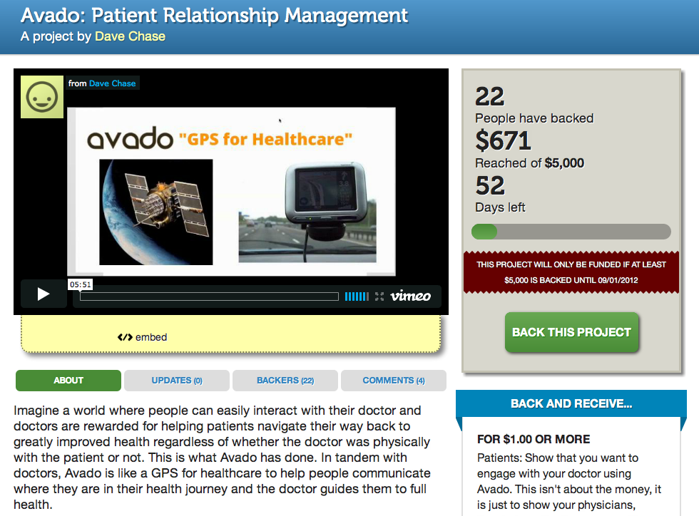 A crowdfunding platform for health projects allows the many who, say, want to help make or find ways to contribute to the health of loved ones to participate actively in the process. And feel a direct connection to projects and their founders and feel they’re making a difference. MedStartr launched with both a diabetes project and a project that supports those with STDS, for example.