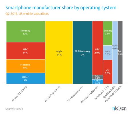 Nielsen released another of their periodic looks at the U.S. smartphone market today, and aside from the revelation that two-thirds of U.S. phone purchasers went for smartphones in Q2 2012, the results are as you’d expect.