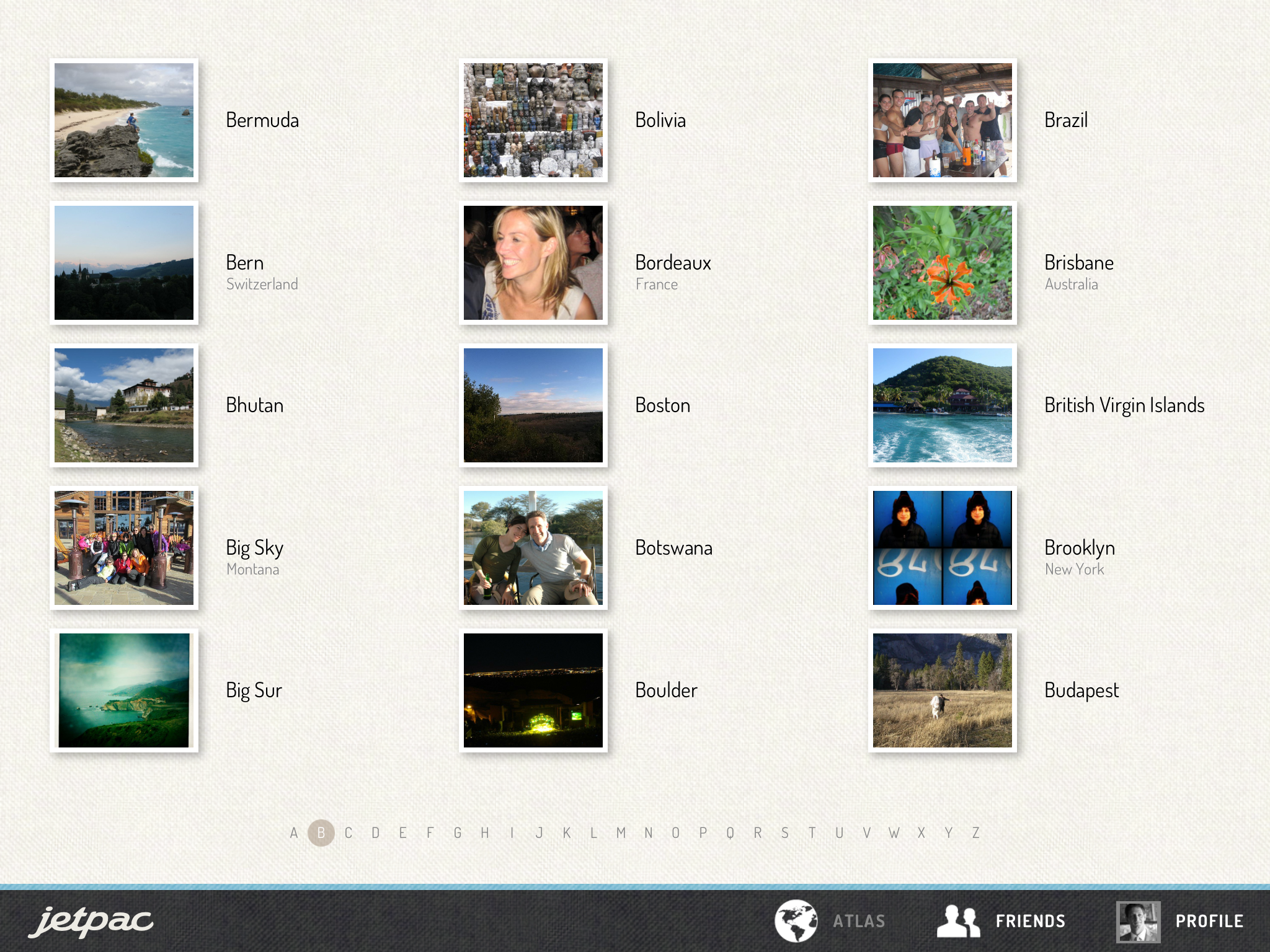 With the updated iPad app, JetPac introduces “Atlas,” a list of cities where your friends have been, as well as a list of friends who have shared travel photos in the past. This allows you to use the app for more purposeful searching, instead of just serendipitous discovery, as in the past.