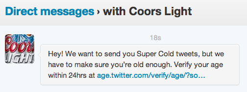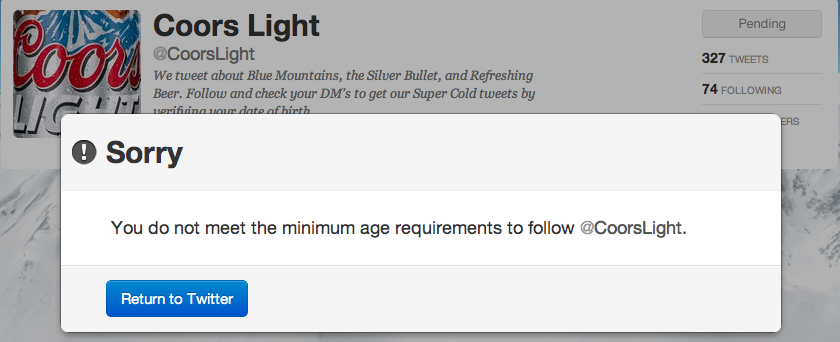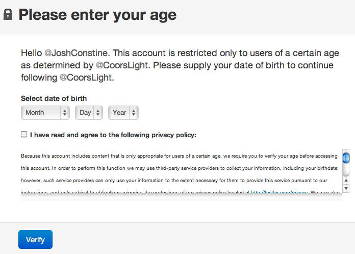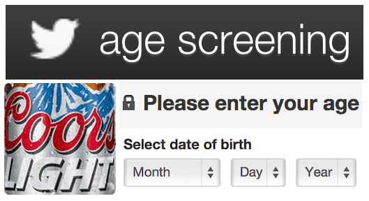 Buddy Media built the product in a partnership with Twitter after alcohol brands requested the microblogging service add the feature to protect them from legal scrutiny. Oddly though, adult brands can still advertise sweet, sweet booze, gambling, and pharmaceuticals to minors on Twitter.