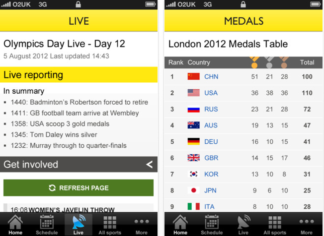 The two-week countdown to the Olympics is on, and the big broadcasters are getting their ducks in line for how they will be streaming, tweeting, sharing, and generally filling your digital life with their own twists on the global sporting event. The latest development comes from the BBC, which today released the iOS and Android versions of its Olympics apps featuring text commentaries, news updates and “medal moments.” There will be separate editions for the UK and the rest of the world: because the BBC only has rights to stream content in the UK, it will only be the UK version that will include streamed video; the international version, the BBC tells me, will only have links to clips on its website. But it will have localized content, using GEO IP targeting to deliver headlines for teams from whatever region you are in above all others.