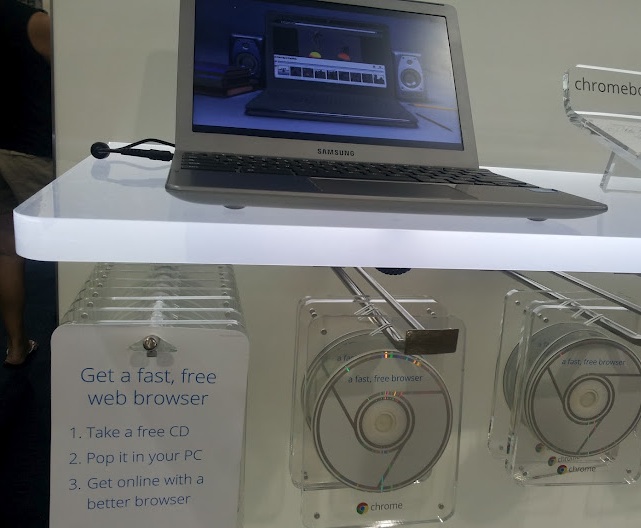At I/O last month, Google announced that it would soon start selling Chromebooks at Best Buy and the first of these Chromebook displays have now found their way into Best Buy’s brick-and-mortar stores across the United States. One thing Google didn’t say at the time was that it would also use these new Chromebook displays to hand out CDs with its Chrome browser on them. As Google+ user Clayton Pritchard found out, though, that’s exactly what Google is doing. The CDs, says Pritchard, hang underneath the Chromebook demo units and come “in really cool plexiglass cases held together by magnets.”