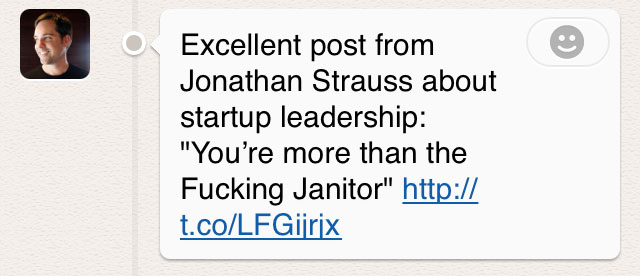 Some people in my network occasionally use Path to share links. These come in two categories. The first is links to things they have written or things written about them/their company. Generally, this fits the tone of Path, although still feels a little off. But since these are generally about accomplishments of people I’m friends with, it’s welcome content. The second category is just standard link sharing that you’d see on Twitter. This feels very weird. Path isn’t an information network like Twitter, it’s a social network. It’s not a place I go for news, it’s a place I go to see what my friends are experiencing. Links to insightful articles unrelated to my friends don’t feel like they belong in this environment.