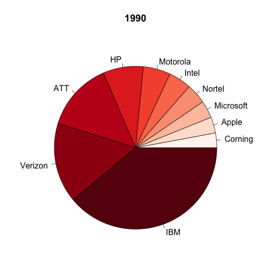 In 1990, telcos and computer makers dominated the ten largest companies. IBM represented more than 35% of the sum of the top 10 market caps and the top 4 companies exceed 75% share. Software maker Microsoft appeared in the top 10 for the first time. NB: Verizon was then known as GTE, the entity at the time.