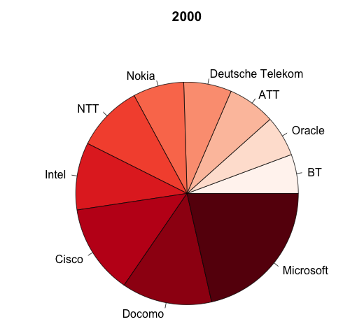 In 2000, software dethroned hardware as market leaders. Growth in IT spending fueled this boom as enterprises clamored to install new technology stacks. Microsoft surpassed IBM, who fell off the top 10 list. Oracle trailed closely, growing with the demand for enterprise databases. Networking and telecom remained at the table as PC sales boomed as telcos deployed the networking infrastructure to interconnect millions of terminals.