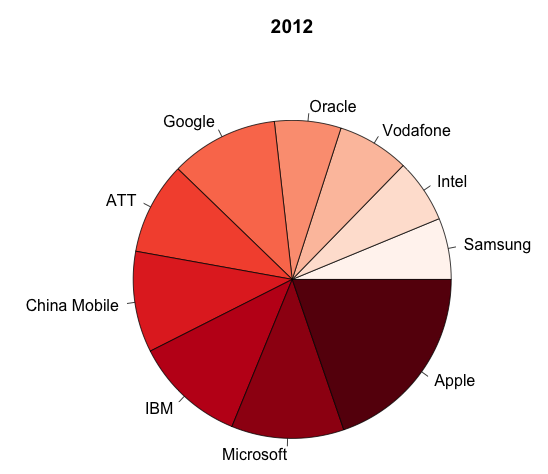 In 2012, mobile became the zeitgeist. Samsung and Apple rocketed to the fore. Mobile carriers form the largest bloc comprising ATT, Verizon, China Mobile and Vodafone. A reinvigorated, software-services-focused IBM joined Microsoft and Oracle representing enterprise software. Google cracked into the rankings as the sole entrant embodying pure Internet. [2]