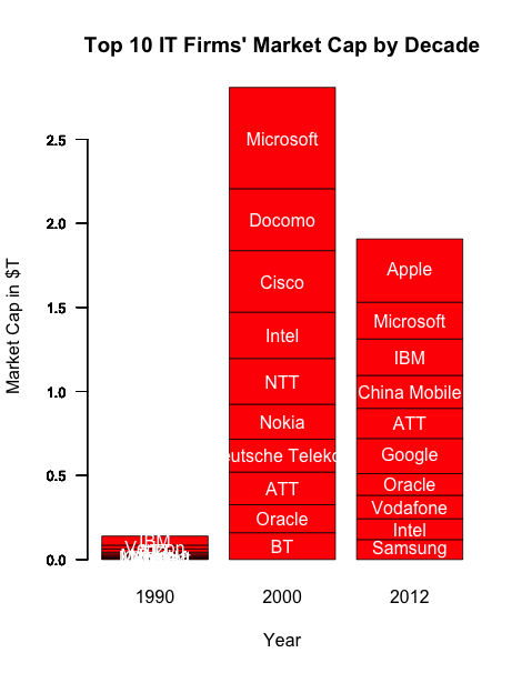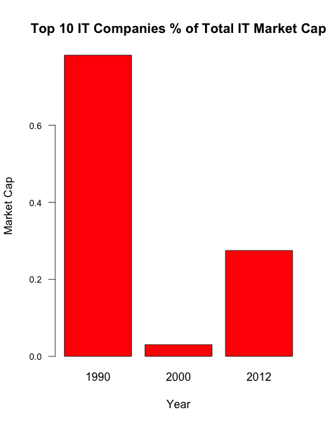 In 1990, technology oligarchs controlled the industry. The largest 10 IT companies represented over 80% of the value of the entire IT sector. In 2000, at the height of the boom, that figure dropped to 5% due to the overzealous IPO glut. In 2012 the top 10 companies’ share rebounded to 30% of total IT market cap, marking a healthy and competitive industry. [2]