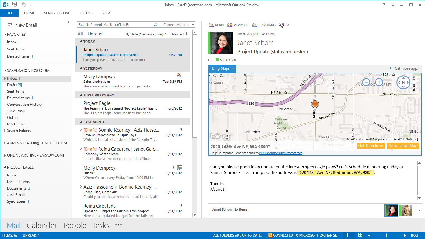 Lync is still the default means of communication between users but Microsoft says Skype will soon be integrated for contacts and chat. Yammer is still TBD as the deal hasn’t yet closed. You’ll be able to “peek” at your schedule without having to switch between your email and calendar. People cards collect your contact’s info in one place reducing redundancy and multiple email accounts can be accessed from Outlook.