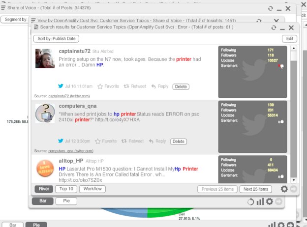 It allows for people to discover the depth of conversation about a particular product or service. For example, it can show what people are saying online about printers and then drilling down further to discover particular customer service issues: