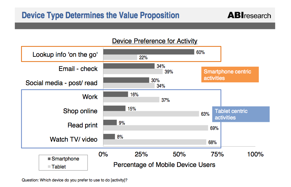 You can see that the tablet actually scores pretty high especially in long-form, lean-back activities like reading and watching TV/video. The numbers in those — 69 percent and 68 percent respectively — are especially stark compared to the numbers on smartphones. The only category in fact where smartphones outscore tablets for usefulness is for on-the-go activities — no surprise, since they are more portable and tend to have cellular connectivity when most tablets do not.