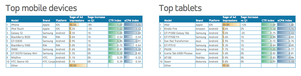 And that’s because this is not just a story of platforms but of devices — and for Apple, it’s still winning massively where that is concerned. Adfonic notes that taken as individual devices, Apple’s are still proving to be the most popular — by quite a long shot.