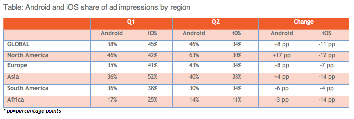 Android is now most-used smartphone platform worldwide, and that swing is being reflected in other areas like mobile advertising. Today some numbers out from Adfonic indicate that in Q2, Android accounted for the majority of mobile ad impressions on its network worldwide, with 46 percent compared to iOS’s 34 percent of impressions. This is the first time Adfonic says it has recorded Android being more popular than iOS. In that, it joins other big ad networks like Millennial Media and InMobi, which both noted Google’s OS overtaking Apple’s earlier this year.