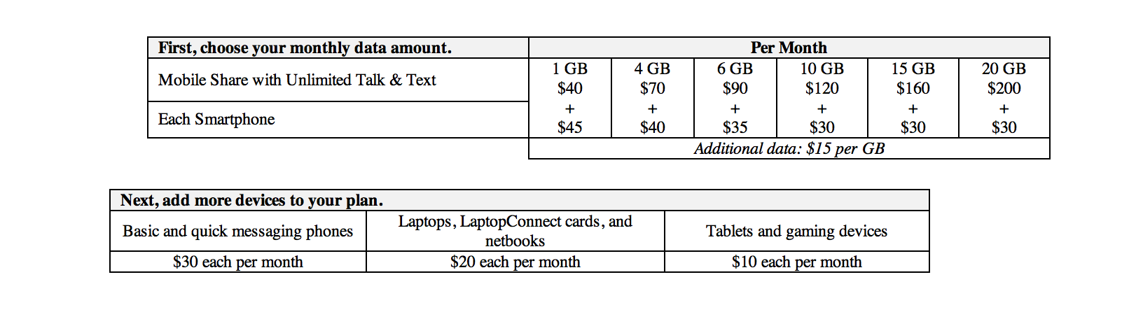 For example, if you’re looking at the 20GB data plan, you’ll have to fork over $200 a month plus an additional $30 per smartphone for a grand total of $230 a month. Add a basic dumb phone for $30/month, a laptop or dongle for $20/month and an additional $10/month for a tablet or gaming device and so on.