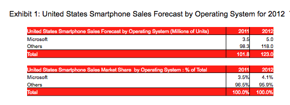 Microsoft continues to make a big push with the Windows Phone platform, but figures out today from Strategy Analytics indicate that it’s still barely moving the needle against the Android/iOS juggernaut. In 2012, Microsoft’s Windows Phone will account for only 4.1 percent of the 123 million smartphones that will be sold in the U.S. in the year. That’s a rise, but of less than one percentage point compared to 2011. In terms of actual unit numbers, this works out to 5 million devices sold in 2012, compared to 3.5 million in 2011.
