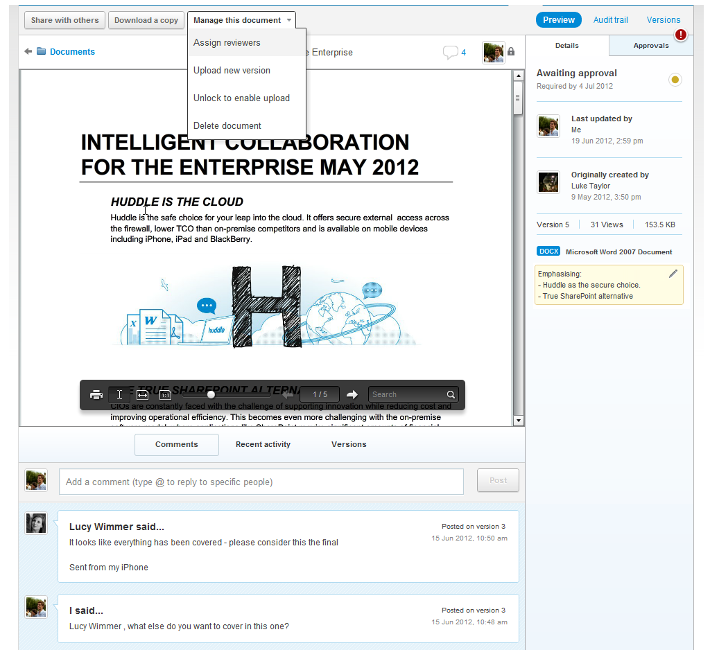 The company has also worked in some features that are a hat-tip to services like Yammer and Twitter, with the ability to @ mention someone to alert them to a message. Also included are version histories and audit trails to look at individual revisions on documents.