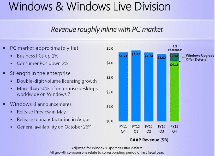 - Windows and Windows Live: $4.15 billion revenue, 1% decrease because of Windows Upgrade Offer deferral (see below)