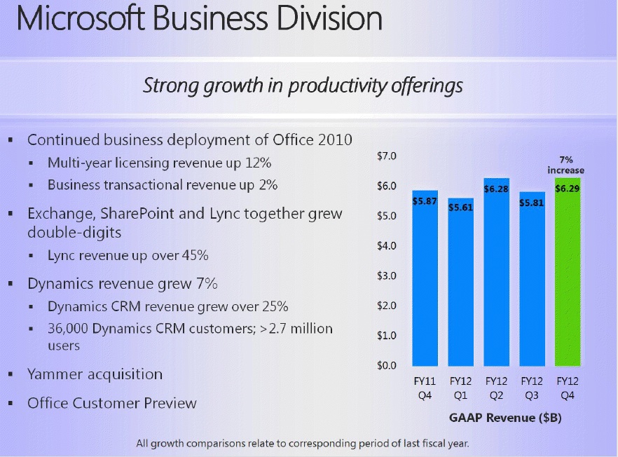 With Windows 8 coming out soon, chances are that some PC buyers are postponing their purchases until the fall, which is partly responsible for the slowdown in PC sales. Microsoft’s Windows Division, which also includes Windows Live, posted some gains last quarter.