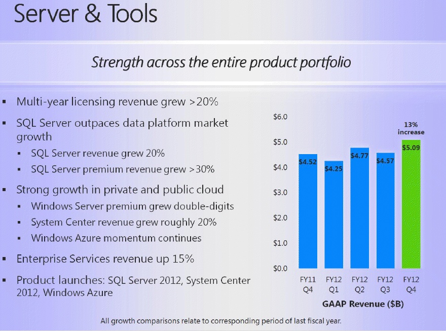 - Server & Tools: $5.09 billion revenue, 13% increase