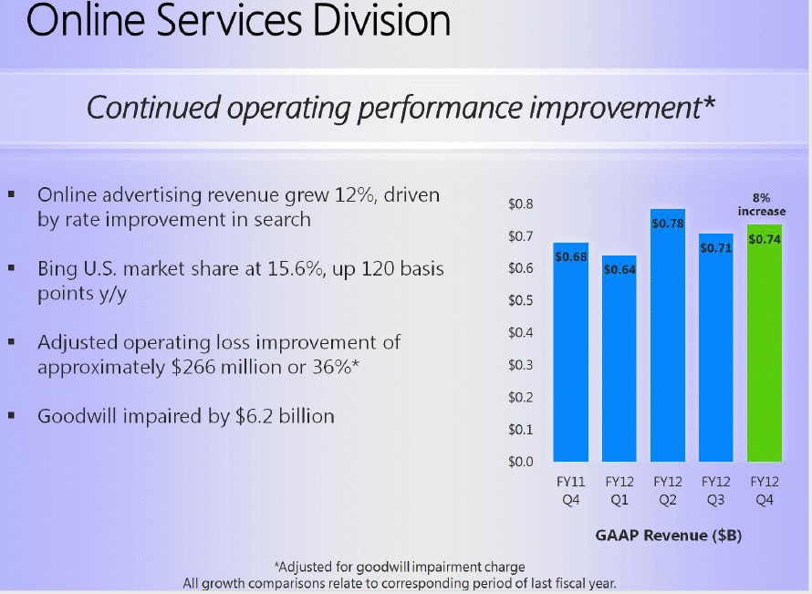 Ahead of today’s announcement, some analysts already expected Microsoft to post its first loss in its 26-year history due to its flopped 2007 acquisition of digital advertising firm aQuantive. Because of this, the Q4 numbers include a $6.2 billion writedown to reflect the lower value of Microsoft’s Online Services Division. The Online Services Division, which is also the home of Bing, has increased its revenue of the last few years but still posted a loss of $479 million last quarter. This quarter, revenue for the Online Services Division grew another 8% and loss was down to $266 million.