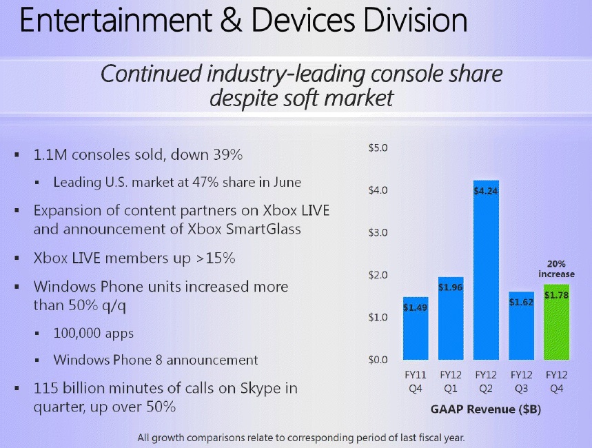 For the full fiscal year, Microsoft reported revenue, operating income, and earnings per share of $73.72 billion, $21.76 billion, and $2.00 per share. Adjusting for the goodwill impairment charge (that is, the aQuantive writedown) and deferred revenue, Microsoft says non-GAAP fiscal year 2012 revenue, operating income, and earnings per share were $74.26 billion, $28.50 billion, and $2.78 per share, increases of 6%, 5%, and 5%, respectively, over adjusted non-GAAP fiscal year 2011 figures.