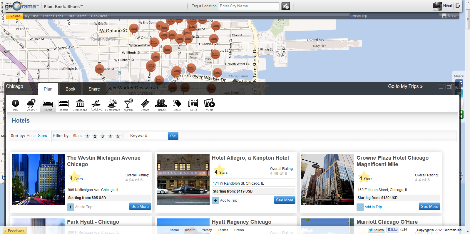 So, what’s the big idea with a “map-based” platform, I wanted to know.”We believe in providing an experience for travelers, something that hasn’t been done that well in the online travel industry so far,” Advani tells me. “We built a one-of-a-kind interactive map from scratch – it’s patent pending – to craft a visual experience that is unique, immersive, and fun,” he says. “Georama is also the only true one-stop solution…we have partnered with 20+ providers (and this is just the initial list) bringing together the best content, fares, and social networks from across the web in one place.” The partners provide the content related to fares, destinations, news, deals, etc. on the site.