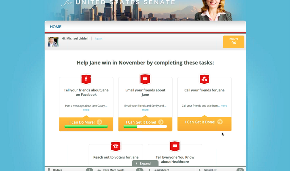 The app, which expands on a version introduced in 2011, matches names, cities and other data points on Facebook to actual voters. After creating a profile for the user, it begins asking that user to engage in campaign activities with these voters in the style of a social game. Campaigns may set the specifics of the game element, assigning certain badges for completing activities, there is also a leaderboard (that can be narrowed down by county) and users receive points for certain tasks.