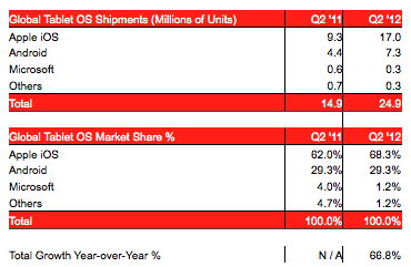 And Android, meanwhile, has grown the number of units it has sold to 7.3 million compared to 4.4 million in 2011; but in the wider tablet market, that has only kept its market share level at 29.3%.