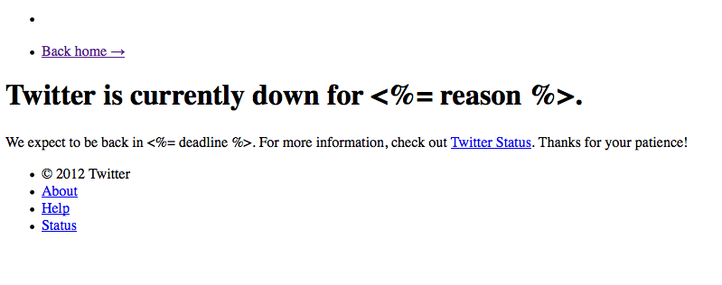 Update: It looks like Twitter is making some progress. The page now goes to this although the scripts to tell people about when to expect the site to work are still not working.