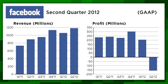 It’s important to note that there are major differences in the non-GAAP (generally accepted accounting practices) and GAAP figures in Facebook’s Q2 report. While it’s typically best to view things through the GAAP lens, this is an exceptional time for Facebook, having just conducted the biggest IPO in recent tech history which required the company to shell out significant amounts of money this past quarter that have nothing to do with its core business. So we’re looking at Facebook’s non-GAAP figures, since they more clearly show the company’s actual performance in a way that can be compared to its history.