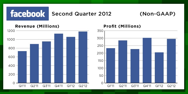 This quarter’s revenue represents a 12 percent boost from its first quarter 2012 sales of $1.05 billion, while the non-GAAP net income is up about 44 percent quarter-over-quarter from the $205 million in profit Facebook posted for the first quarter of this year. The numbers are also up on a year-over-year basis: Revenue is 32 percent higher than Q2 2011’s revenue of $895 million, while the non-GAAP net income is up slightly less significantly, by 3.5 percent year-over-year compared to $285 million in Q2 2001.