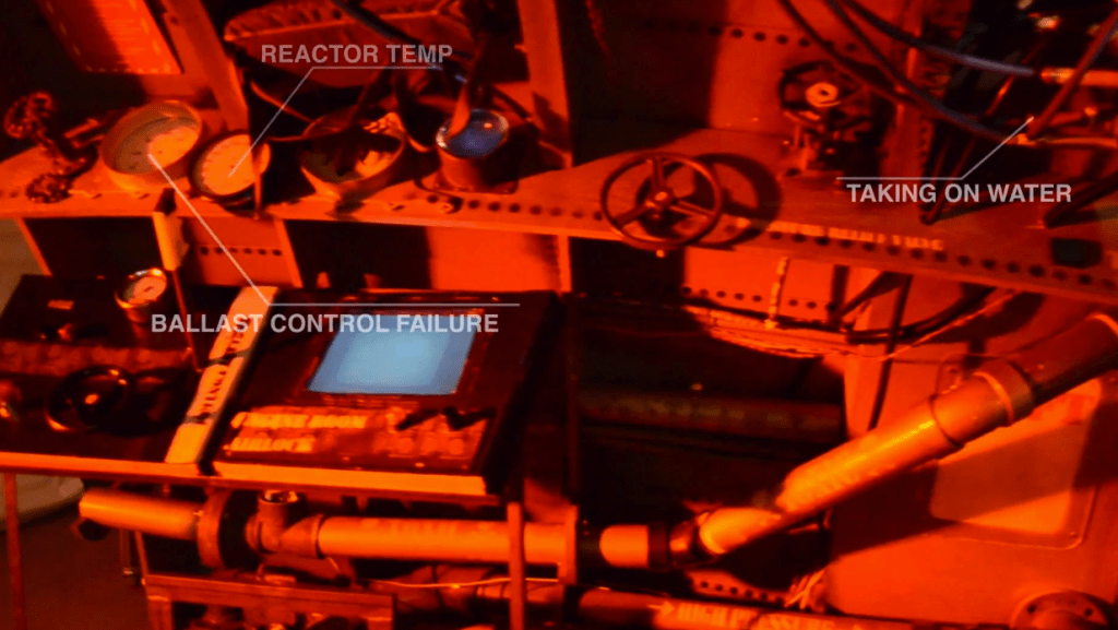 The game employs 3 Arduino micro-controllers that simulate the attack of a submarine, which is built to the scale and likeness of a real submarine. There are various levers and valves that the user must trigger to repair different threats to the submarine, such as a high pressure hull rupture, radiation levels, reactor temperature, or a depth charge.